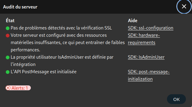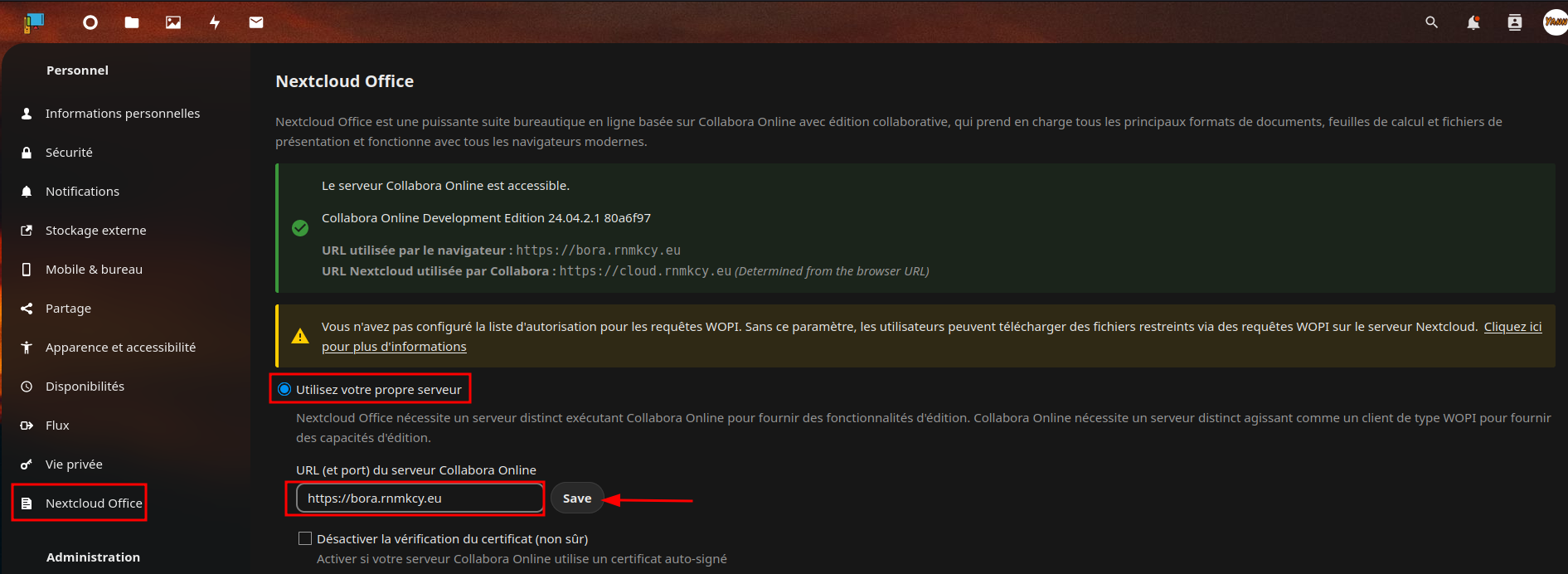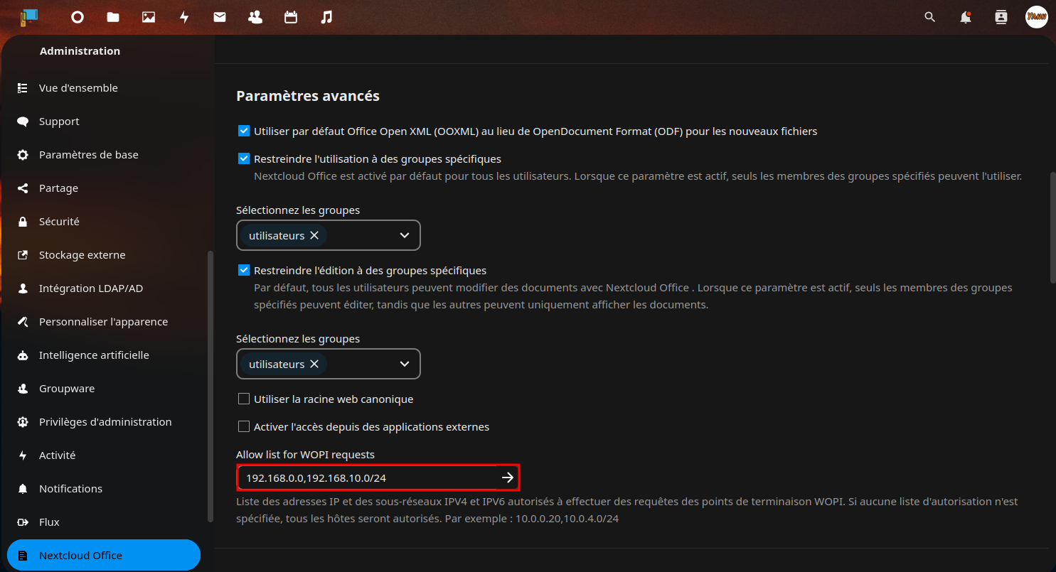 Seuls certains hôtes désignés sont autorisés à accéder au serveur Collabora. Pour désigner Nextcloud comme client de confiance, définir storage.wopi.host avec le domaine Nextcloud, par exemple, cloud.rnmkcy.eu.