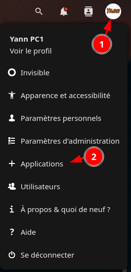 - Cliquez sur le profil administrateur, représenté par un cercle dans le coin supérieur droit de la fenêtre et choisissez + Applications pour afficher le panneau des applications.
