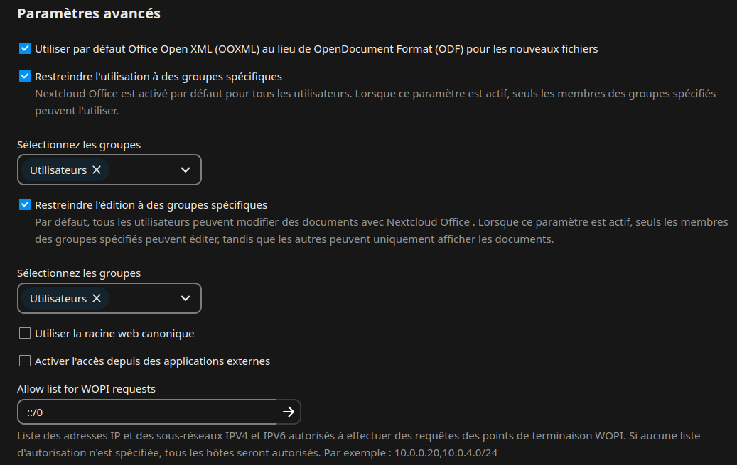- Repérez la section Paramètres avancés en bas de la page. Assurez-vous que la case Utiliser Office Open XML (OOXML) au lieu d’OpenDocument Format par défaut pour les prochains fichiers est cochée. Cela permet de s’assurer que tous les fichiers sont compatibles avec Microsoft Office. Pour plus de sécurité, entrez le nom du domaine Collabora à côté de Autoriser la liste pour les requêtes WOPI.