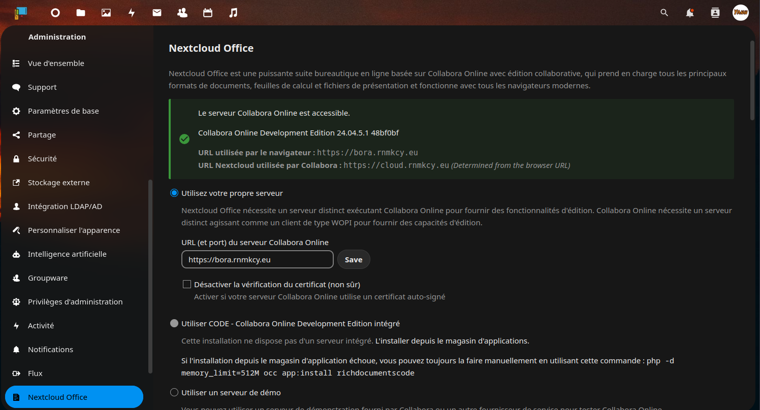 - Nextcloud affiche les paramètres de Nextcloud Office. Activez le paramètre Utiliser votre propre serveur en cliquant sur le bouton radio. Ceci fait apparaître une boîte de texte pour entrer l’URL (et le Port) du serveur Collabora Online. Saisissez ici le sous-domaine de Collabora, par exemple, https://collabora.example.com et cliquez sur Enregistrer. Si la connexion est réussie, Nextcloud confirme que le serveur Collabora Online est accessible.