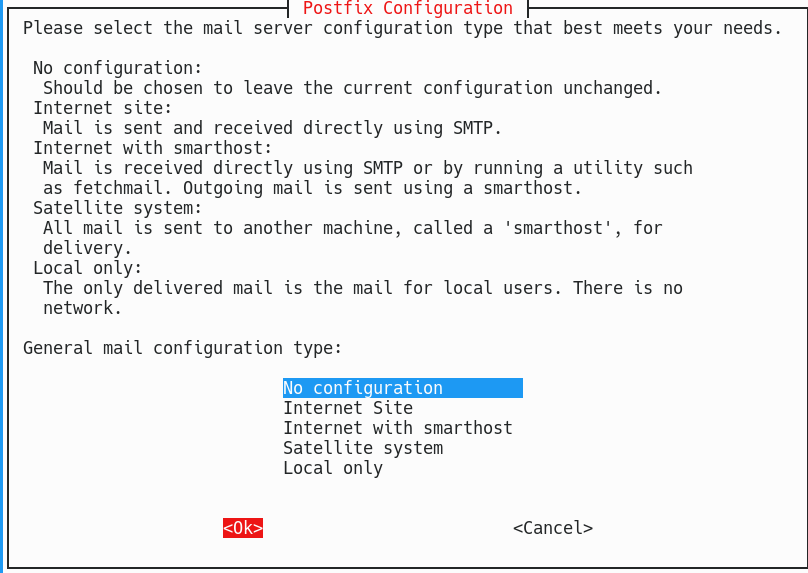 Choix No configuration lors de l’installation, il existe un fichier main.cf.proto pour servir de base à une configuration personnalisée.