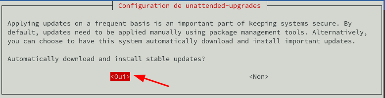 La fenêtre suivante apparaîtra après avoir exécuté la commande ci-dessus, vous demandant automatiquement si vous souhaitez télécharger et installer automatiquement les mises à jour stables. Utilisez la touche de tabulation pour sélectionner l’option Oui et appuyez sur Entrée.