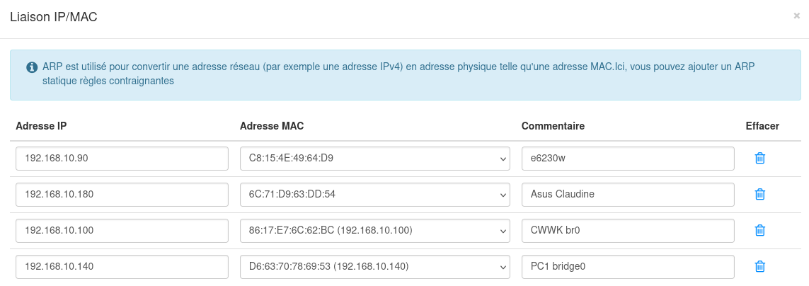 On attribue une adresse IP fixe 192.168.10.140 en lien avec adresse mac sur le routeur