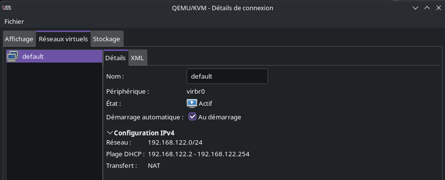 Ouvrir l’application Virt-manager. Faire un clic droit sur QEMU/KVM et cliquer sur l’option Détails.