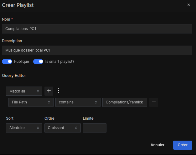 Créer une playlist nommée Compilations-PC1 avec le contenu du dossier Compilations/Yannick