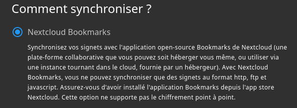 âž Synchronisez via Nextcloud Bookmarks, Google Drive ou un service compatible WebDAV