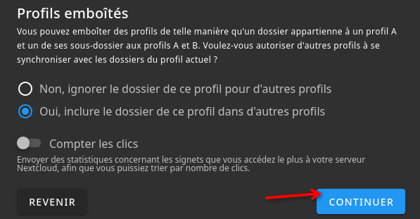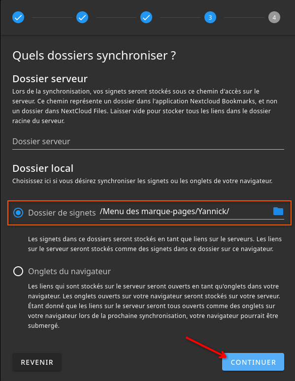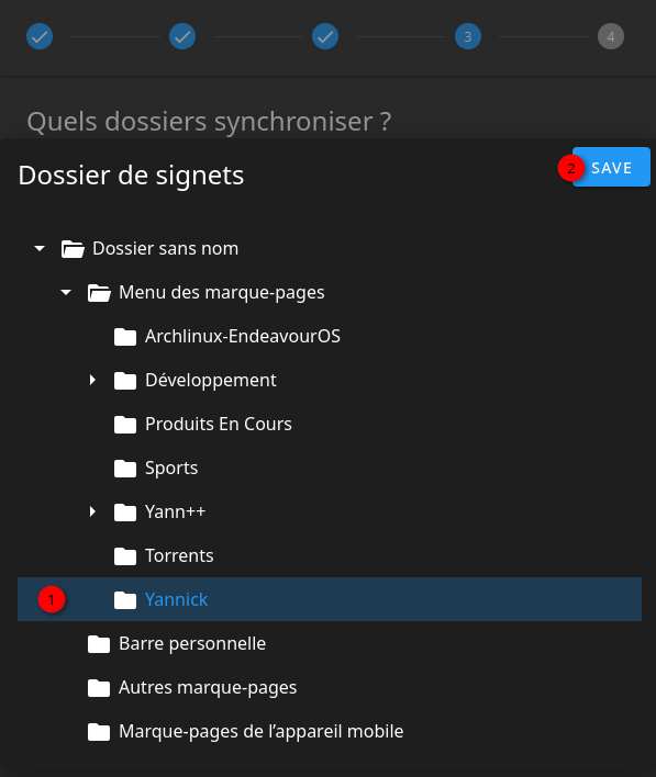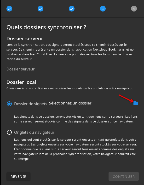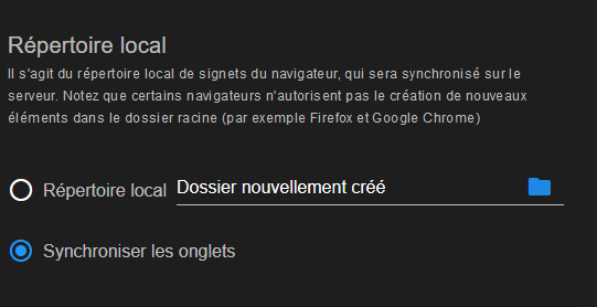 De retour sur le paramĂ©trage de lâextension, cette derniĂšre souhaite savoir, dans quel dossier nous allons synchroniser les favoris
