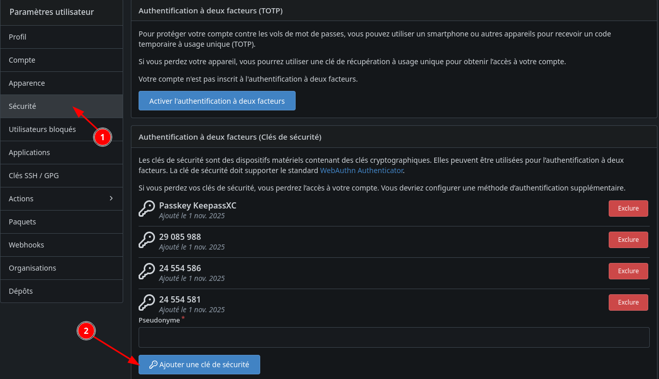 Ajouter le passkey et les clés matérielles (au minimun 2 pour éviter un problème en cas de perte ou dégradation)