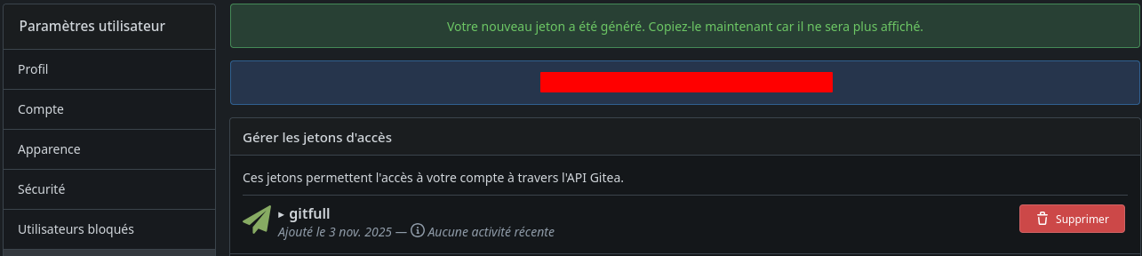 { .normal} - Dès la génération, copiez le jeton immédiatement, comme il ne sera plus affiché. Ce jeton est essentiel pour pousser les paquets à Gitea: