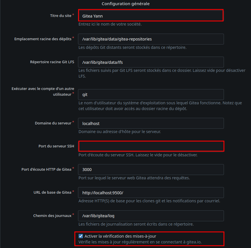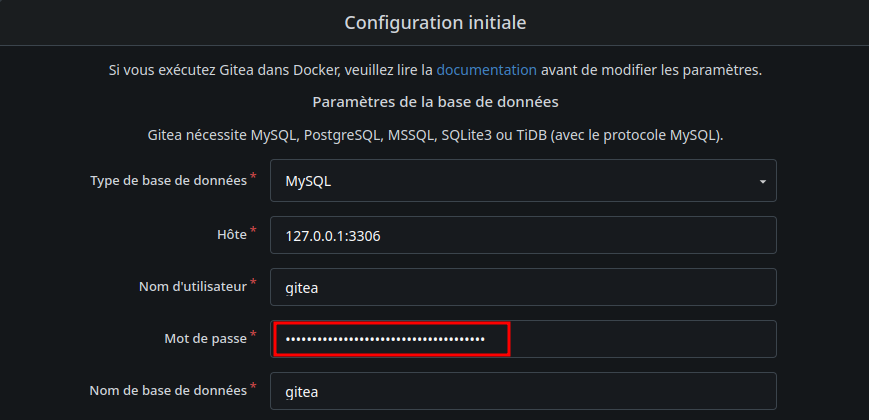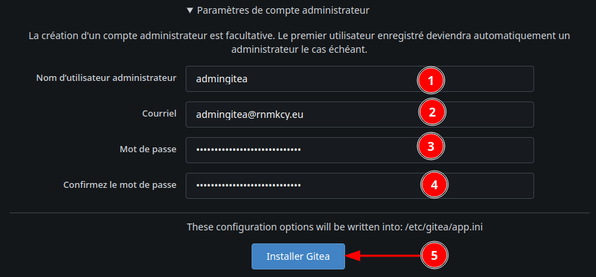 Le nom d’utilisateur et le mot de passe fournis doivent correspondre à ceux fournis dans la section Créer base gitea