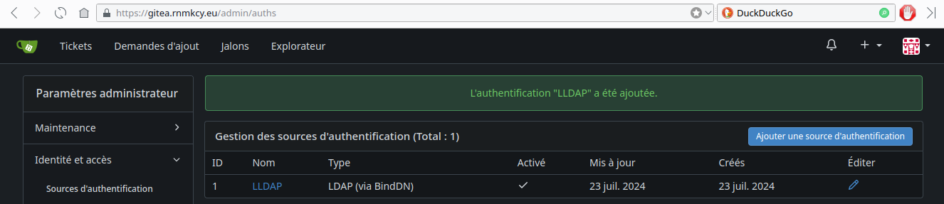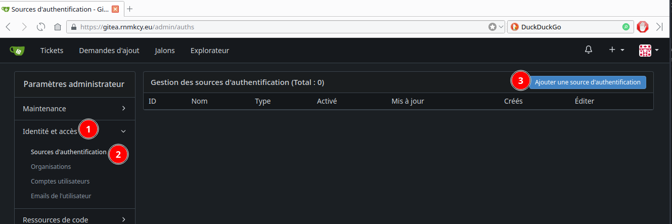 Dans Gitea, aller à “Administration du site”, “Identité et accès”, “Sources d’authentification” et cliquer sur “Ajouter une source d’authentication”