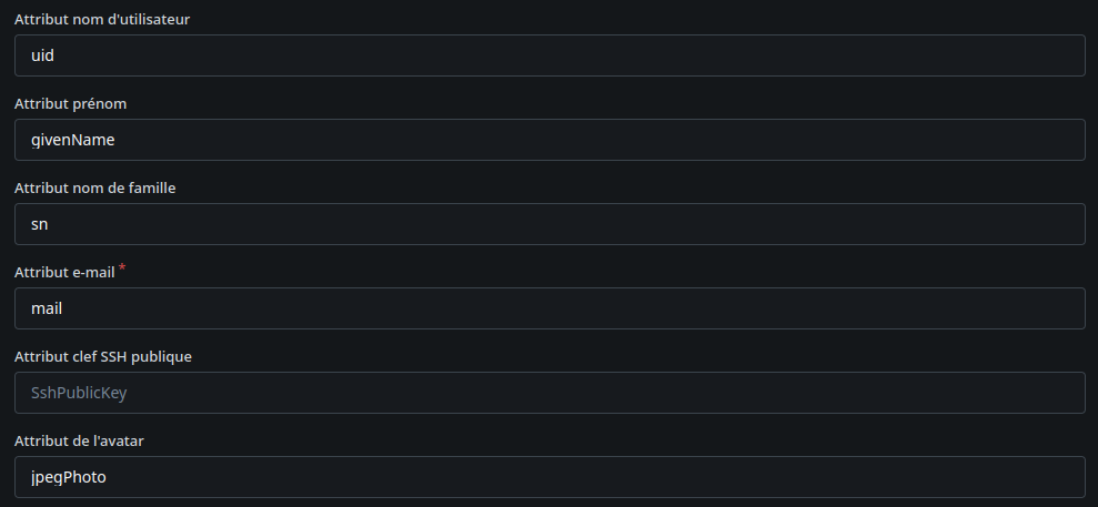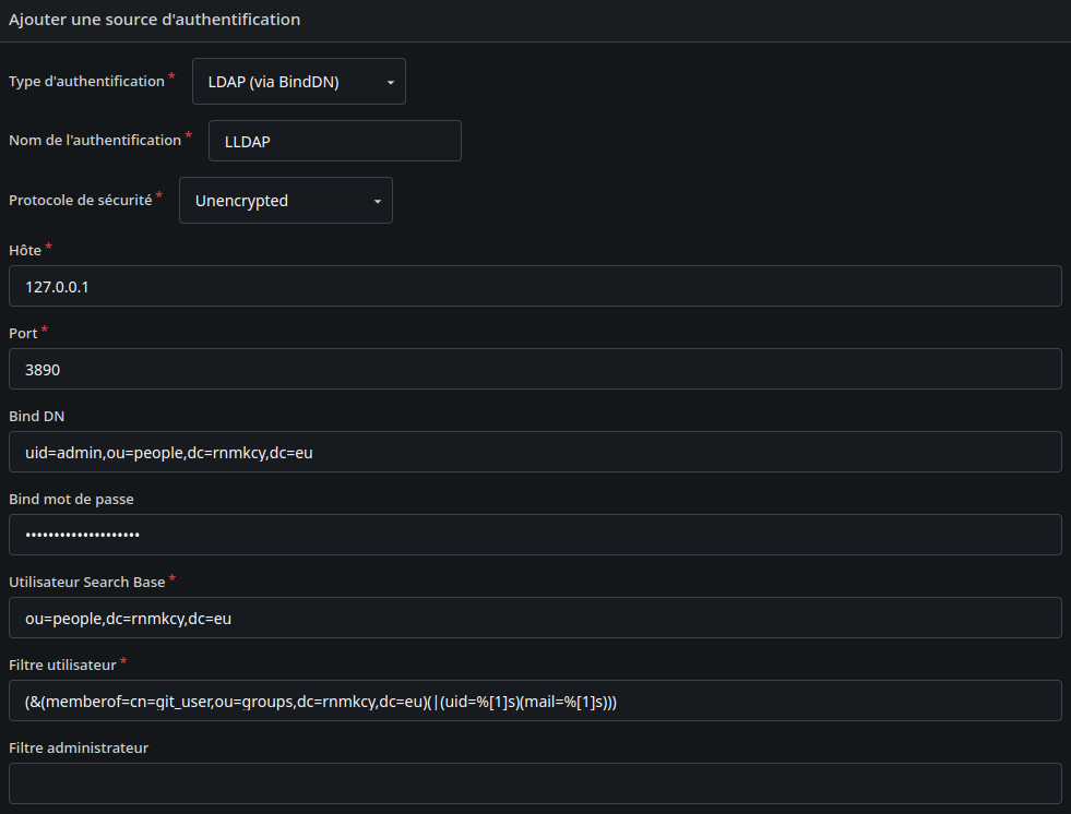 (memberof=cn=lldap_admin,ou=groups,dc=rnmkcy,dc=eu)si vous voulez que les administrateurs lldap deviennent des administrateurs Gitea. Laissez vide sinon.