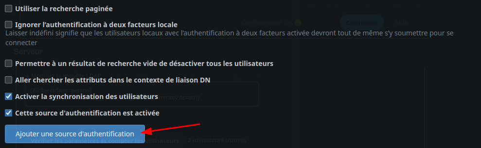 ou=people,dc=rnmkcy,dc=eu - Filtre utilisateur: Si vous voulez que tous les utilisateurs puissent se connecter, utilisez