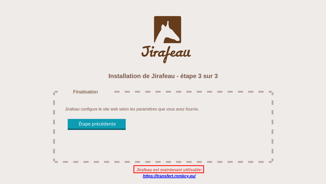 Ouvrir le navigateur sur l’emplacement installé https://transfert.rnmkcy.eu