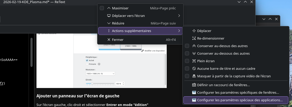 clic droit sur la barre de menu ou titre –> Actions supplémentaires –> Configurer les paramètres spécifiques de fenêtres…