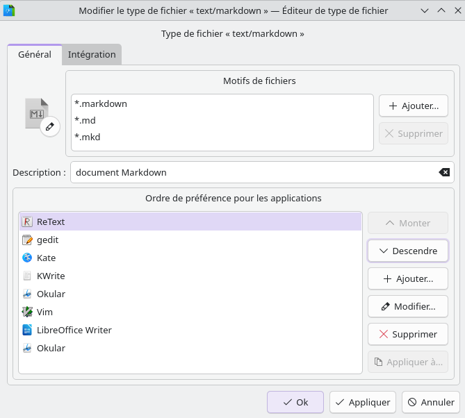 - Utilisez cette fenêtre pour modifier l’application par défaut associée au type de fichier sélectionné dans KDE Plasma
