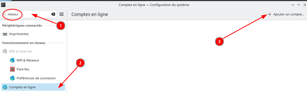 Comptes en ligne est un endroit central pour ajouter, supprimer et configurer des comptes pour divers services en ligne tels que Nextcloud, Google et autres. L’ajout d’un nouveau compte en ligne permet à n’importe quelle application KDE d’interagir avec le service - par exemple, l’ajout d’un nouveau compte Google vous permet d’accéder automatiquement aux fichiers Google Drive de Dolphin.