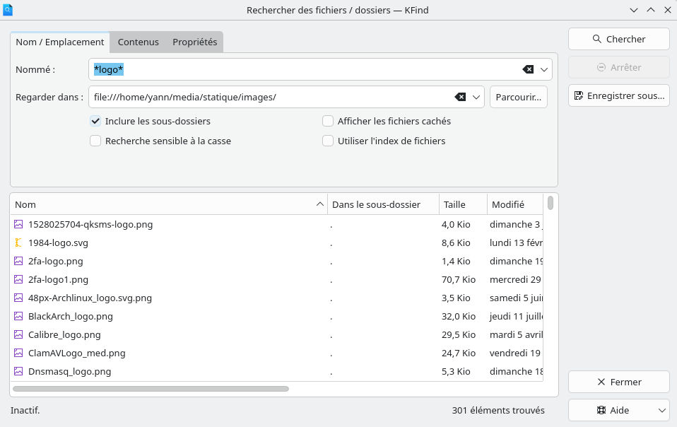 KFind peut être utilisé comme outil de recherche autonome, lancé depuis KRunner ou depuis votre menu. Il s’intègre également dans Dolphin, comme option « Ouvrir KFind » dans le menu « Outils ». Il vous permet de rechercher des fichiers selon leur nom, leur type ou leur contenu.