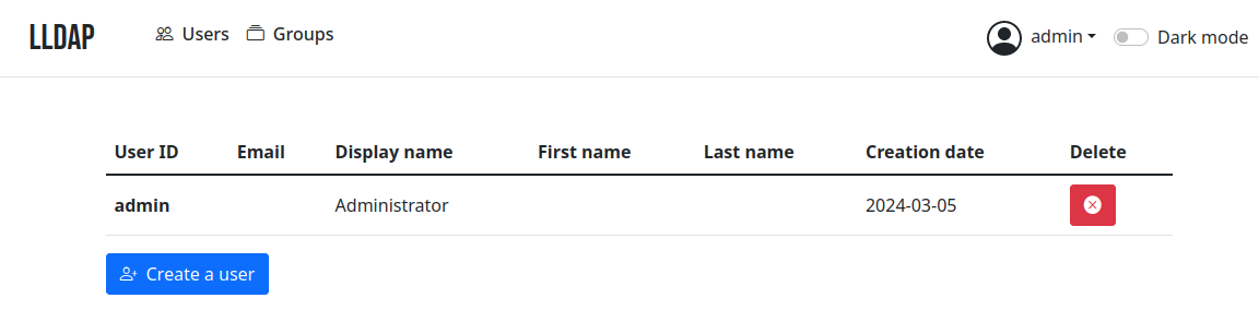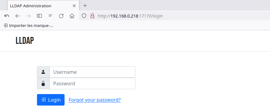 Le compte par défaut est admin et le mot de passe est contenu dans le fichier “/srv/lldap/secrets/LDAP_USER_PASS”.