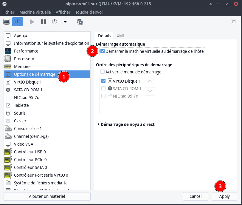 Note: La dernière version Alpine Linux est alpinelinux3.22 au 14/10/2025 mais KVM ne connait que alpinelinux3.21 (sudo virt-install --osinfo list |grep alpine)