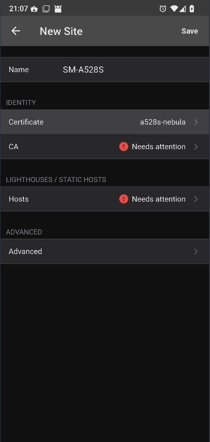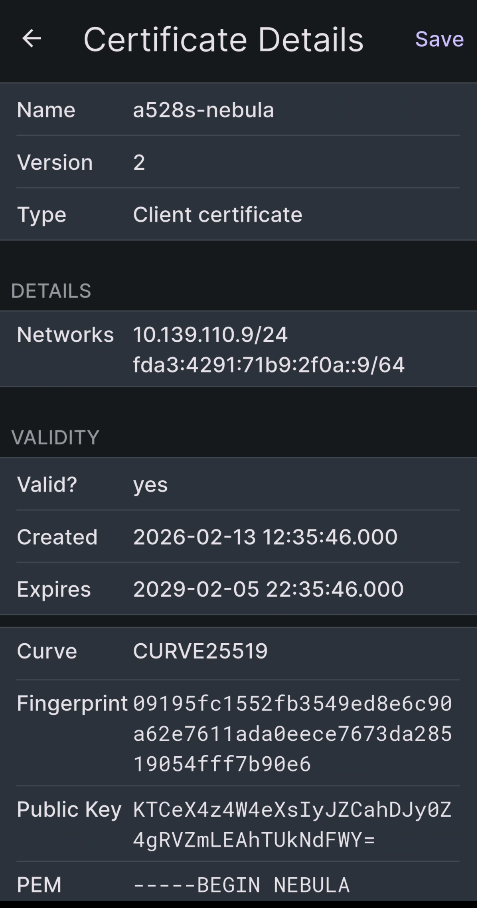 ./nebula-cert sign -duration 26232h00m00s -name "a528s-nebula" -networks "10.139.110.9/24,fda3:4291:71b9:2f0a::9/64" -groups "mobiles"