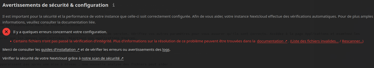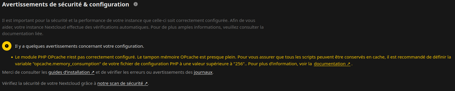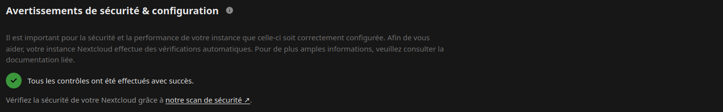 Il est important pour la sécurité et la performance de votre instance que celle-ci soit correctement configurée. Afin de vous aider, votre instance Nextcloud effectue des vérifications automatiques. Pour de plus amples informations, veuillez consulter la documentation liée.