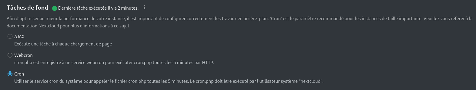 16 - Réactivez la tâche cron nextcloud. (Voir l’étape 4 ci-dessus.)