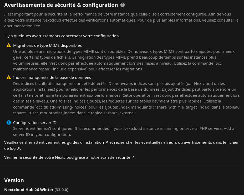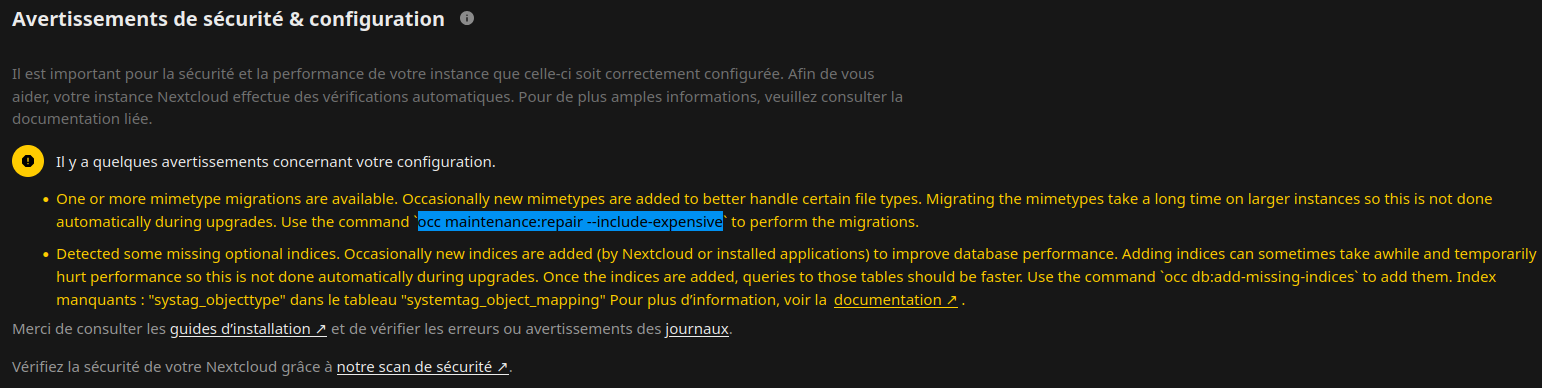 Des indices facultatifs manquants ont été détectés. De nouveaux indices sont parfois ajoutés (par Nextcloud ou les applications installées) pour améliorer les performances de la base de données. L’ajout d’indices peut parfois prendre un certain temps et nuire temporairement aux performances. Cette opération n’est donc pas effectuée automatiquement lors des mises à niveau. Une fois les indices ajoutés, les requêtes sur ces tables devraient être plus rapides. Utilisez la commande occ db:add-missing-indices pour les ajouter. Index manquants : “properties_name_path_user” dans le tableau “properties”, “calobjects_by_uid_index” dans le tableau “calendarobjects”