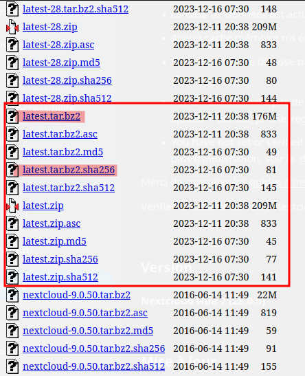 2 - Téléchargez et décompressez la dernière version de Nextcloud Server (fichier d’archive) depuis https://download.nextcloud.com/server/releases/ dans un répertoire vide en dehors de votre installation actuelle.