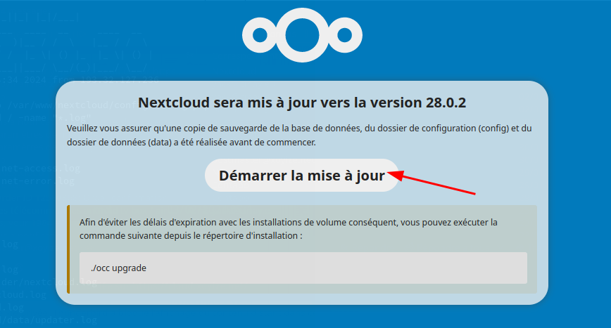 Exécuter la commande : sudo -u nextcloud php occ upgrade