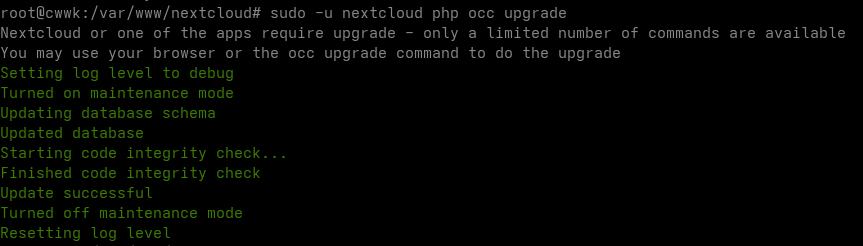 sudo -u nextcloud php occ upgrade