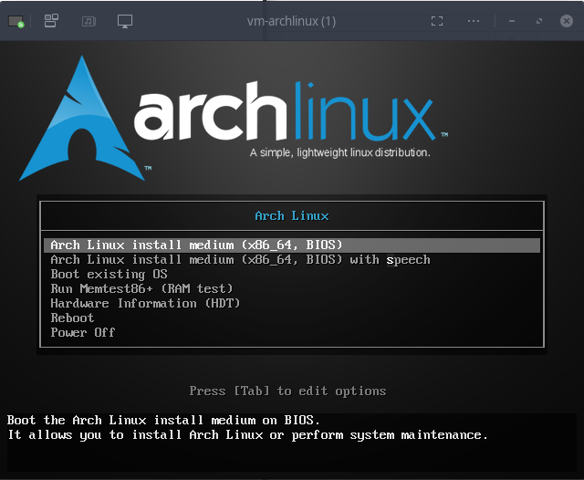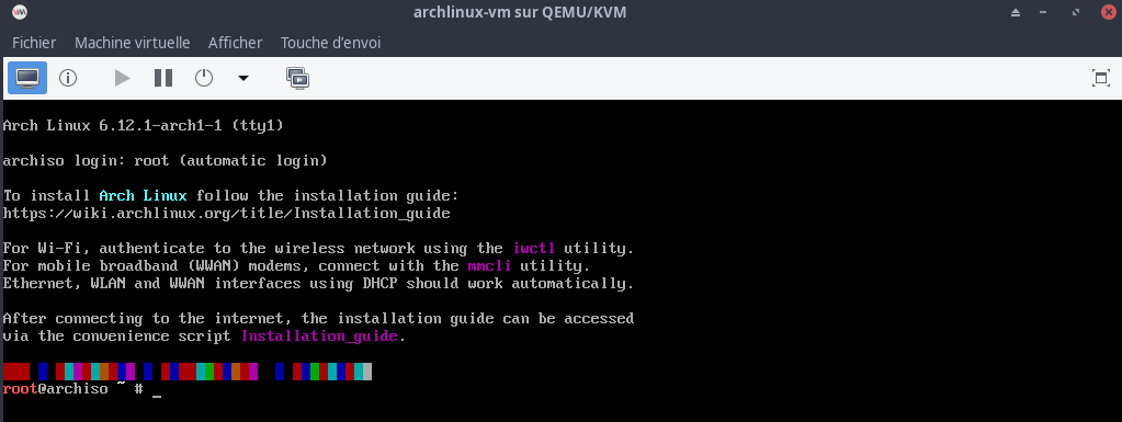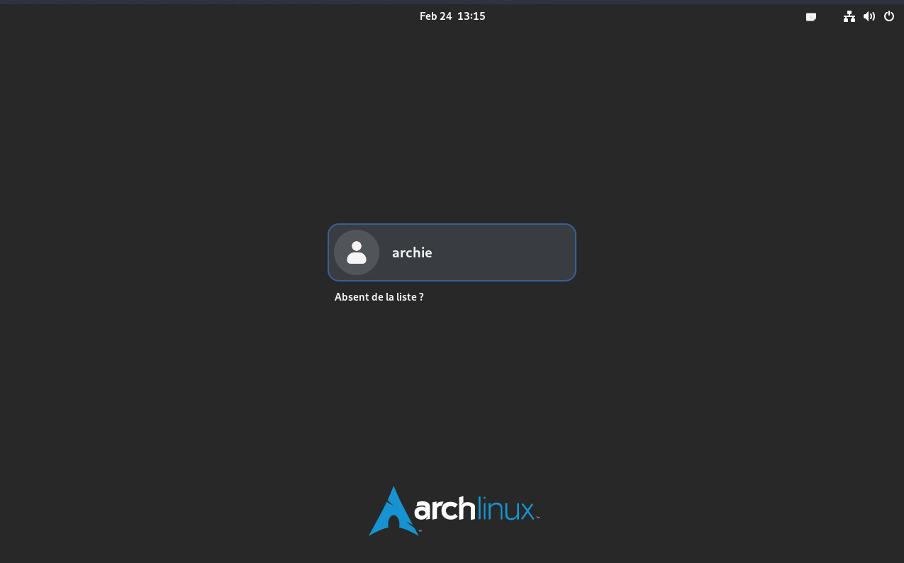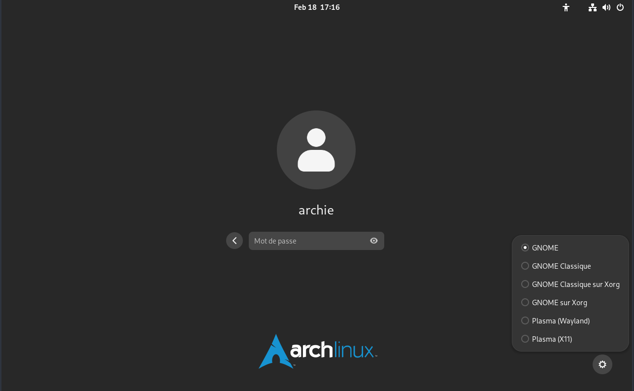 Les étapes suivantes supposent que vous disposez d’une installation de base d’Arch Linux sans environnement de bureau ni gestionnaire de fenêtres. Vous pouvez installer une version de base d’Arch Linux à l’aide du script archinstall