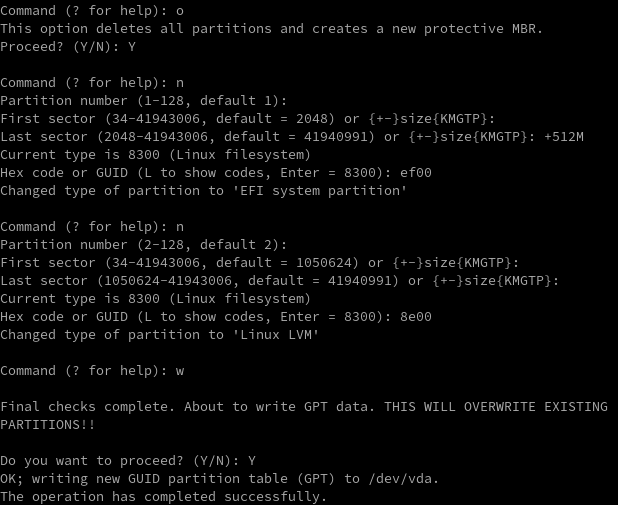 - La partition 2 devrait être une partition Linux LVM (8e00).