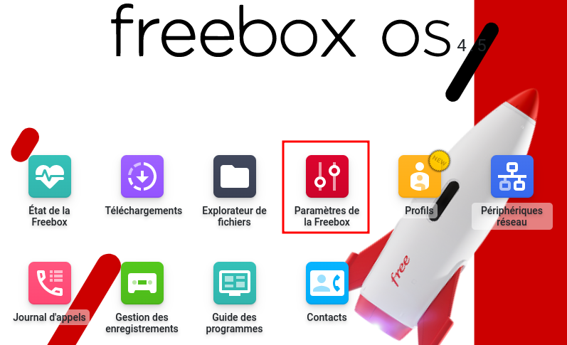 Après authentification vous êtes sur la page d’accueil et double-clic sur Paramètres de la Freebox