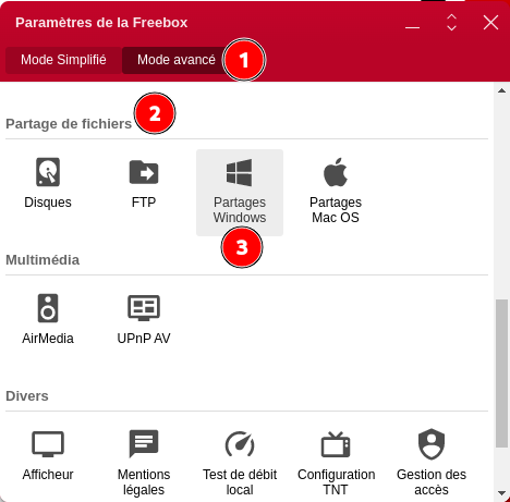 En Mode avancé dans la rubrique Partage de fichiers double-clic sur Partages Windows