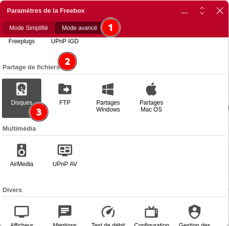 En Mode avancé dans la rubrique Partage de fichiers double-clic sur Disques