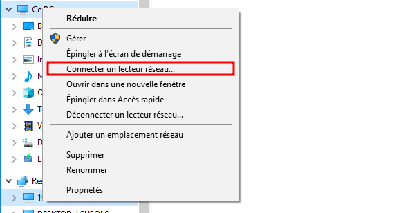 Afin de faire apparaître le disque dur de la Freebox comme un disque dur classique sur votre ordinateur. Rendez-vous dans l’explorateur de fichiers puis faites un clic droit sur Ce PC puis Connecter un lecteur réseau…: