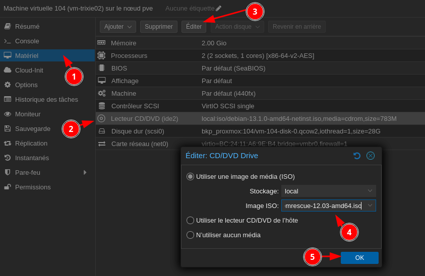 Dans les paramètres de votre VM Debian 13, sélectionnez CD/DVD Drive et choisissez l’image ISO de SystemRescue.