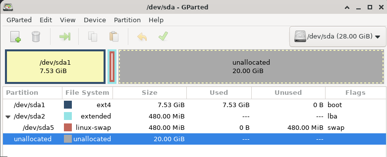 Vous verrez votre disque /dev/sda1 de 7.53 Go, une partition étendue /dev/sda2 qui contient /dev/sda5 pour le swap, et un espace non alloué de 20 Go.