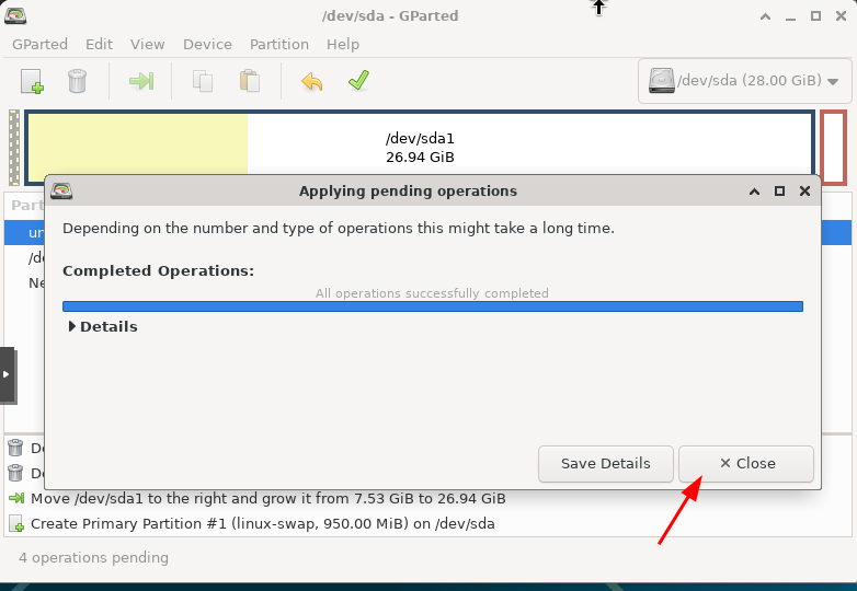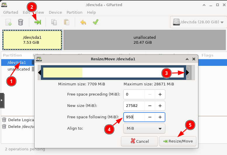 Cliquez sur l’icône de redimensionnement et ajoutez 20 Go à /dev/sda1. Laissez environ 950 Mo pour le swap.