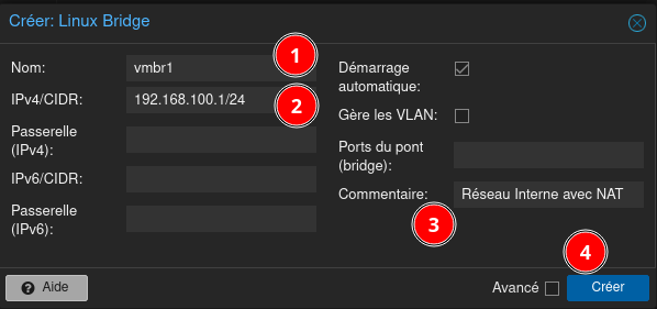 - IPv4/CIDR : 192.168.100.1/24 (ou une autre adresse IP selon vos besoins)