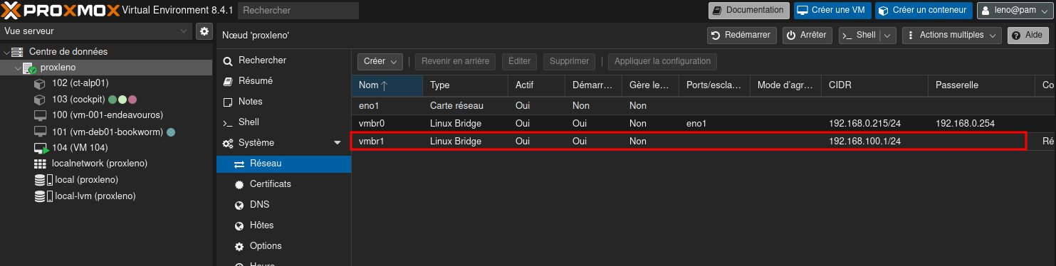 Le réseau vmbr0 existe, on va ajouter un nouveau pont vmbr1 pour notre réseau interne avec NAT.