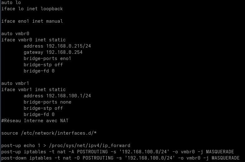 post-down iptables -t nat -D POSTROUTING -s '192.168.100.0/24' -o vmbr0 -j MASQUERADE