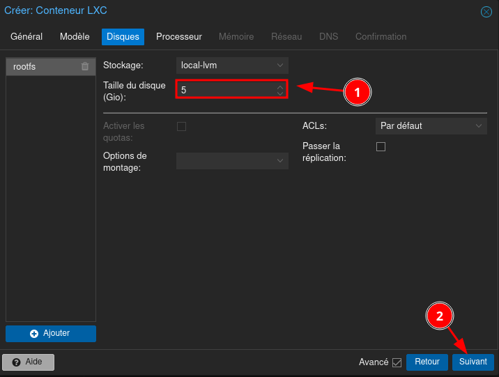 Conteneur non privilégié : cette option permet de choisir au moment de la création si vous voulez créer un conteneur privilégié ou non privilégié.