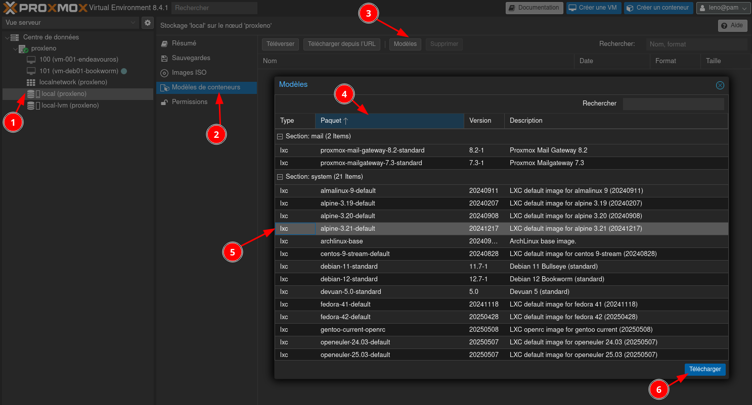 Proxmox VE lui-même fournit une variété de modèles de base pour les distributions Linux les plus courantes. Ils peuvent être téléchargés en utilisant l’utilitaire de ligne de commande GUI ou pveam (short for Proxmox VE Appliance Manager). En outre, les modèles de conteneur TurnKey Linux sont également disponibles à télécharger.