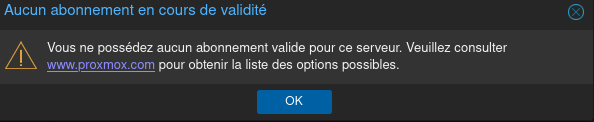 Une boîte de dialogue apparaît en disant qu’il n’y a pas d’abonnement valide pour le serveur. Proxmox offre un service complémentaire optionnel auquel vous pouvez vous abonner. Pour ignorer le message, cliquez sur OK.