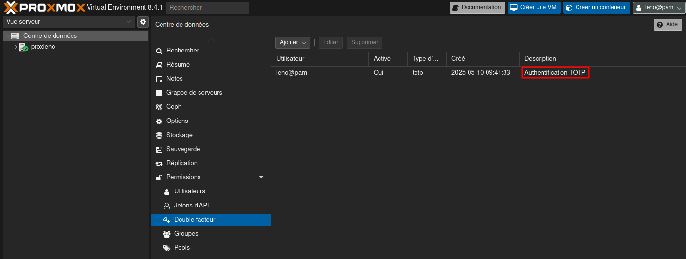 Cette commande permet d’ajouter l’utilisateur à la base d’authentification proxmox