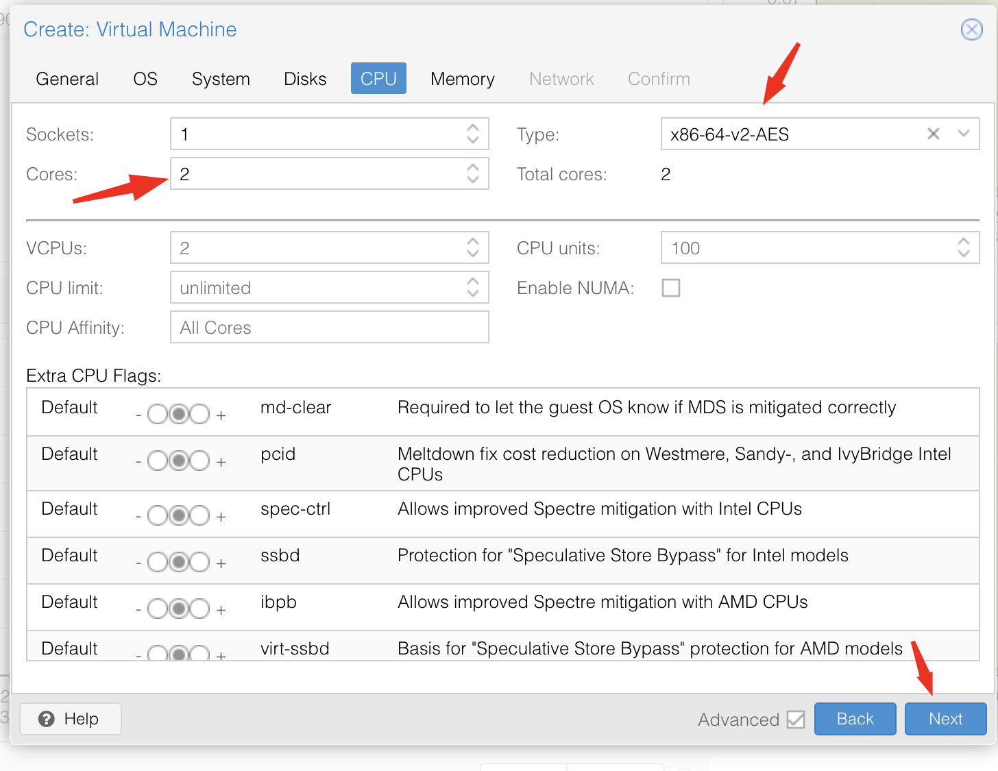 Type : garde x86-64-v2-AES ou host, selon ce que Proxmox propose par défaut
