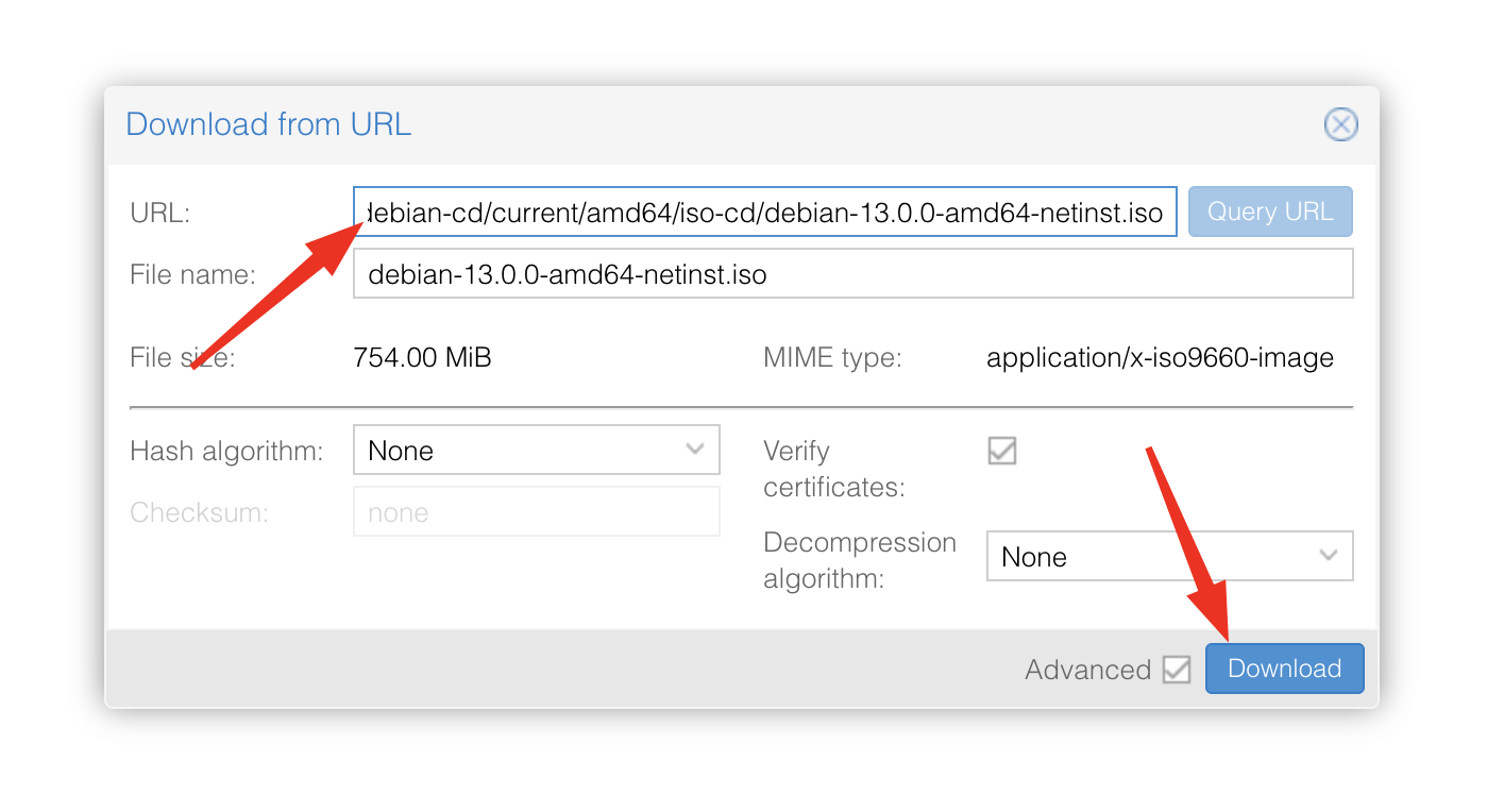 Download from URL : plus rapide et pratique, cette option vous permet de coller directement le lien de téléchargement de l’image ISO depuis le site de Debian.
