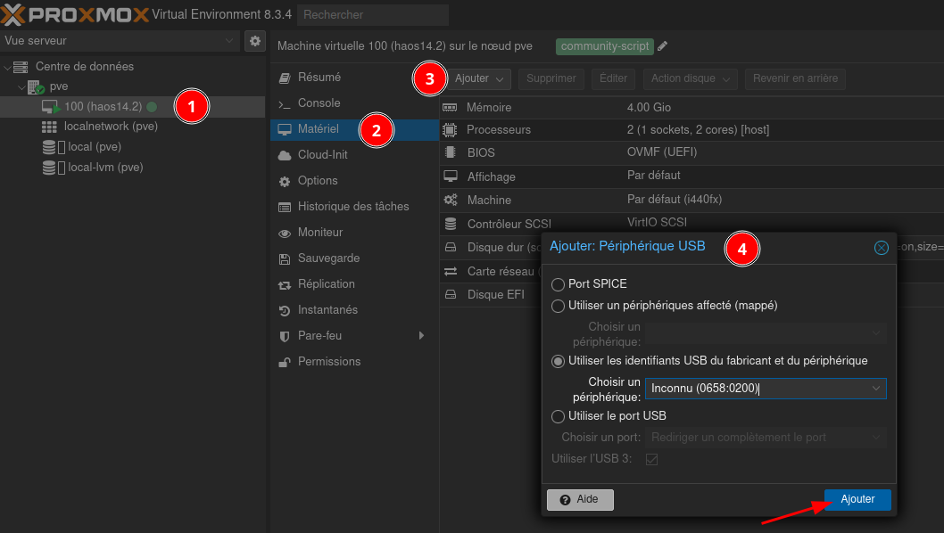 Pour connecter un périphérique USB sur le Serveur Proxmox :